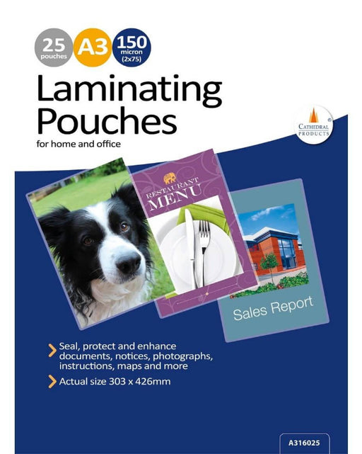 A3 Laminating Pouches, 150 micron 25pk.Seal, protect and enhance documents, notices, photographs, instructions, maps and more.