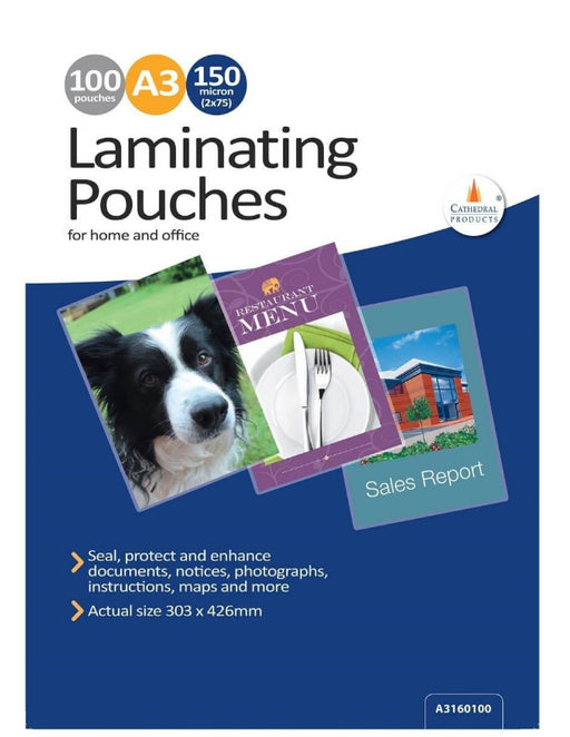 A3 Laminating Pouches, 150 micron 100pk.Seal, protect and enhance documents, notices, photographs, instructions, maps and more.