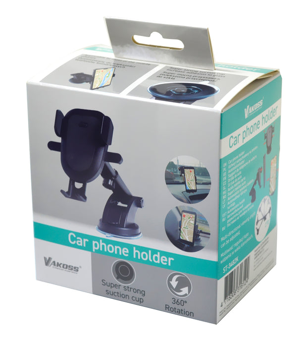 The VAKOSS® car phone holder is a versatile accessory that is compatible with most mobile phones and GPS devices. It features a multi-directional viewing angle that can be adjusted to your preference, with a 360° rotation capability for optimal positioning.
