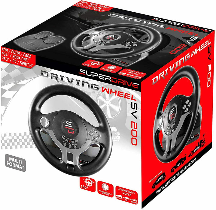 Subsonic SV200 SuperDrive Steering Wheel is a complete steering wheel. Compatible with PS4, Xbox One and Nintendo Switch. The Driving Wheel is the essential accessory for playing racing games on these console systems.